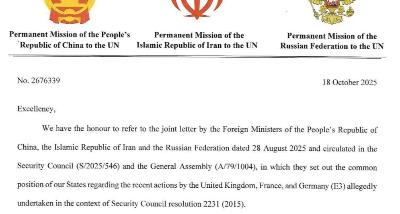 As clearly Stated in common letter of Foreign Ministers of People's Republic of China, Islamic Republic of Iran and Russian Federation dated 28 August 2025, addressed to UN Secretary General and Presidents of UN Security Council and General Assembly, the E3 action is illegal and unwarranted and their move should not affect the legal reality of the resolution's termination on October 18, 2025, and any attempt to revive expired sanctions after this date will be considered as null and void.