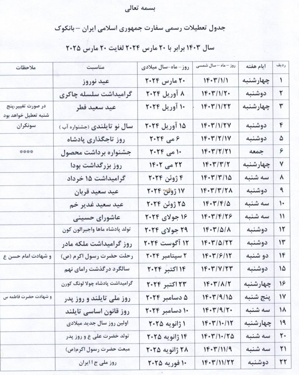 تعطیلات رسمی سفارت جمهوری اسلامی ایران در بانکوک در سال 1403