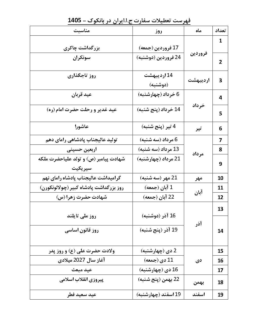 تعطیلات سفارت ج.ا.ایران در بانکوک - 1405
