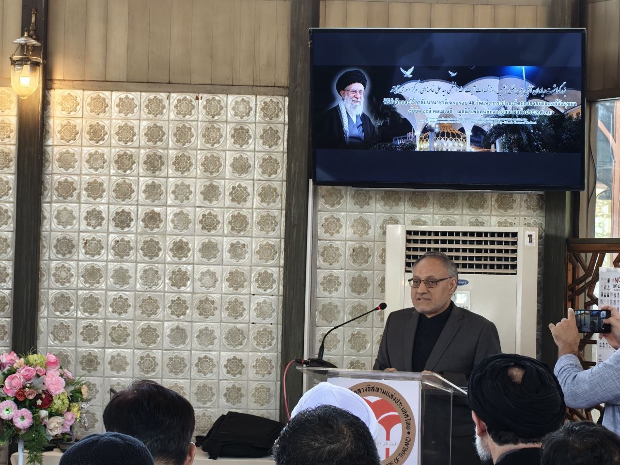 آنها گمان میکردند با بمباران و ترور شخصیت ها میتوانند اراده ملتی را که شهادت را سعادت می داند در هم بشکنند. اما حقیقت این است که هر قطره خونی که در غزه و تهران فرو ریخت، بذر بیداری را در جوانان مسلمان از شرق تا غرب عالم کاشت و این سنت الهی است. شما مسلمانان تایلند، همواره به اعتدال، محبت و همزیستی مسالمت آمیز شناخته شده اید. اما امروز بخشی از وظیفه دینی و اسلامی ما تبری از ستمگران است. حضور شما محترمان در این مرکز اسلامیبه مناسبت چهلمین روز شهادت رهبر عالی ایران، حضرت آیت الله خامنه ای، پیامی روشن به جهان دارد که امت اسلام یک پیکر واحد است و مسلمانان هرگز زیر بار ظلم نمی روند.